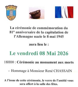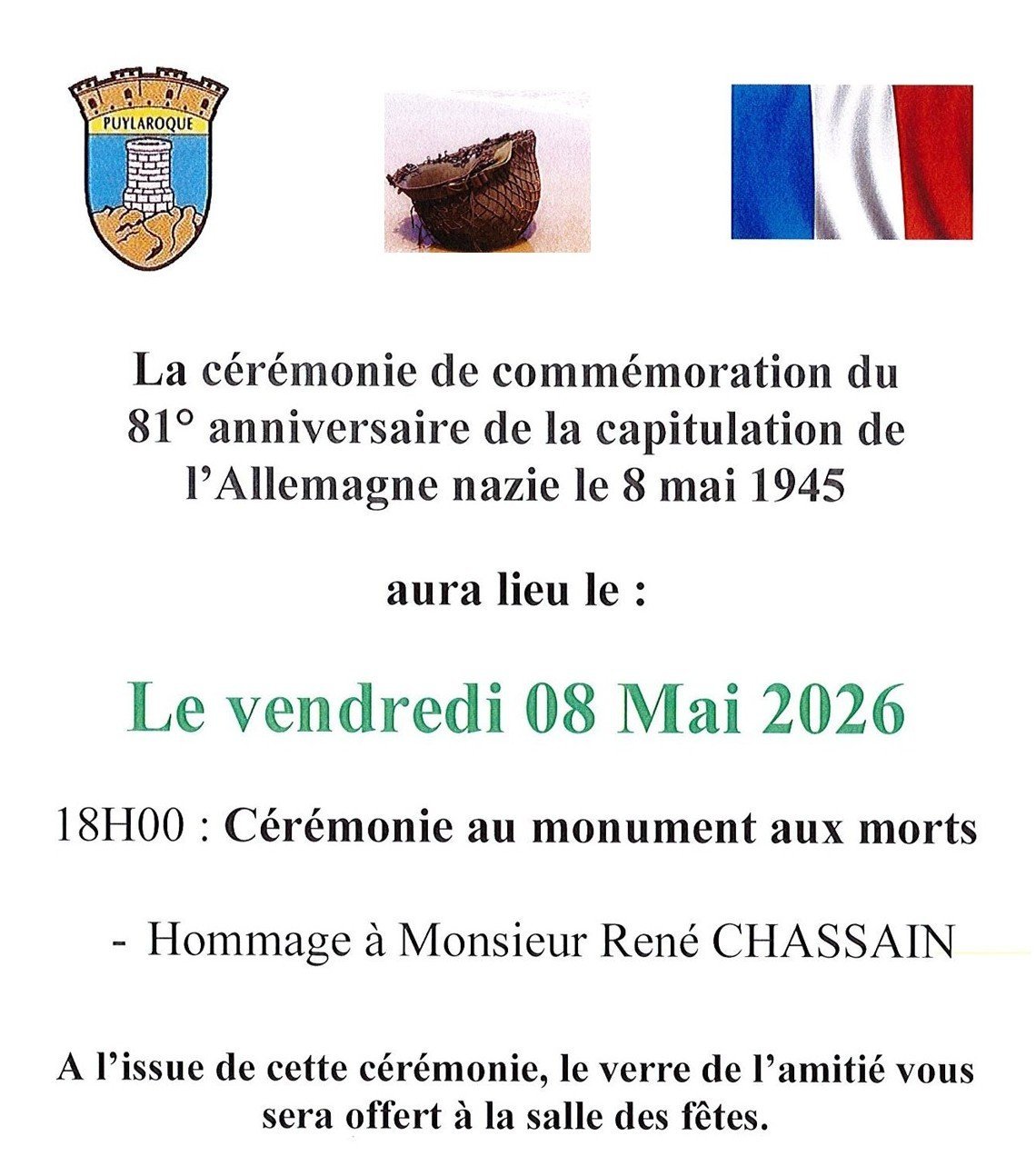 La cérémonie du 8 mai 2026 aura lieu à 18h00 au monument aux morts de Puylaroque et rendra hommage à M. René Chassain.