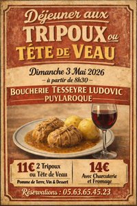 Le dimanche 3 mai Ludovic Tesseyre nous concocte à partir de 8h30, un déjeuner aux tripoux ou tête de veau, à sa boucherie. Il affiche deux formules à 11€ ou 14€. Il est préférable de réserver au 05 63 65 45 23